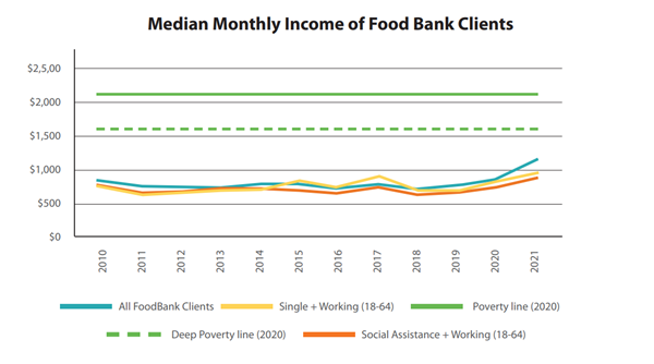 In plain language, even if the income of a typical food bank user was doubled, they would still be in poverty. In 2021, people’s monthly incomes to cover everything was $1,106 a month (or $1,070, adjusted to 2020 dollars). In fact, a large number would still be deep poverty.