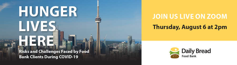 On Thursday, August 6 at 2 pm, Daily Bread Food Bank CEO, Neil Hetherington will be moderating an online conversation between Daily Bread Food Bank Vice President of Research and Advocacy Talia Bronstein and Valerie Tarasuk, professor at the Department of Nutritional Sciences and principal investigator at PROOF: Food Insecurity Institute (University of Toronto), as they discuss research findings and policy recommendations from our latest report, ‘Hunger Lives Here: Risks and Challenges Faced by Food Bank Clients During COVID-19.’